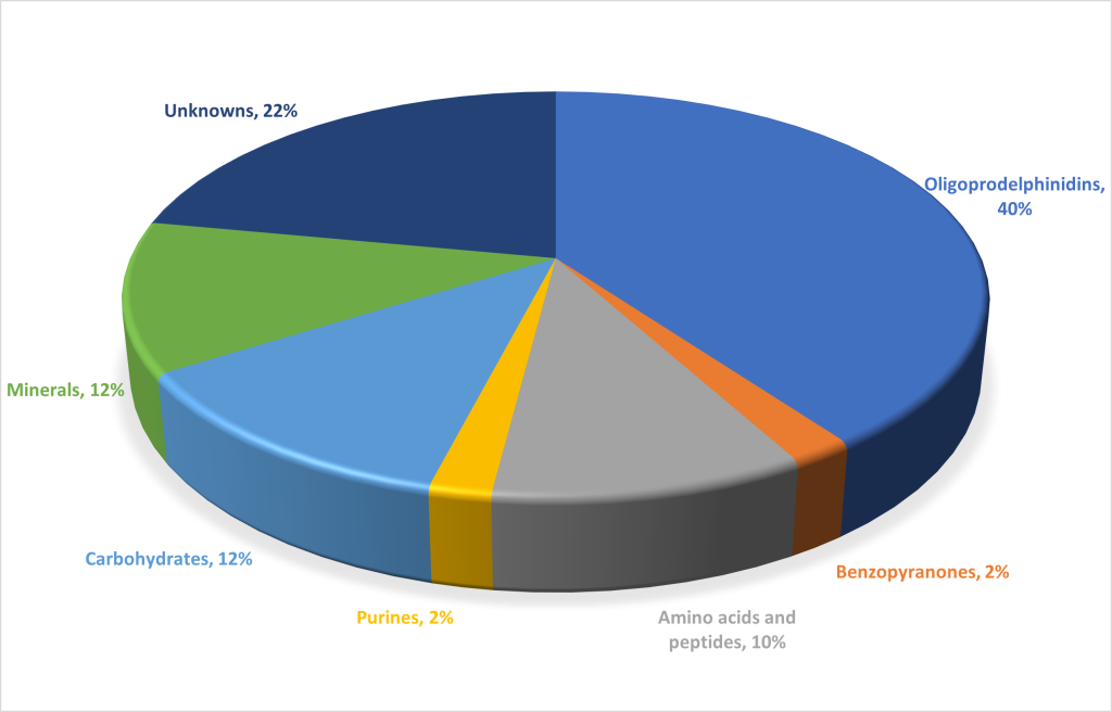 Primary plant metabolites (carbohydrates, amino acids/peptides and minerals/inorganic salts) make up the next most prevalent constituents. Purine derivatives including DNA/RNA and cellular signalling chemicals GMP and AMP.